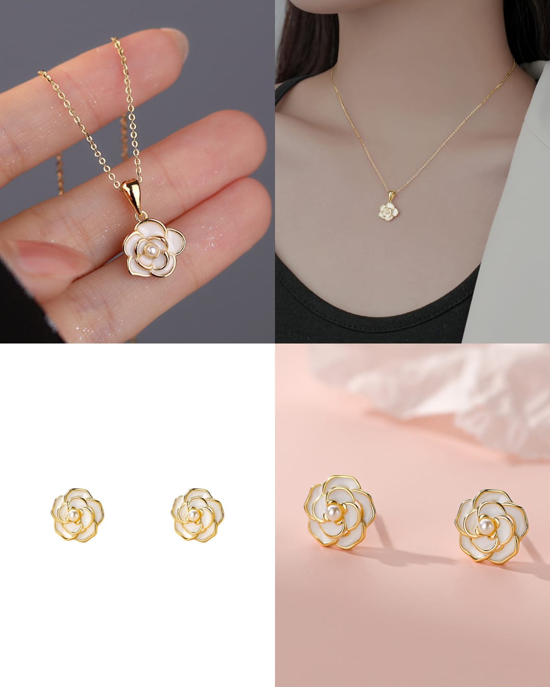 Adorn yourself with the elegance of our Silver 925 White camellia design necklace with matching earrings! Crafted with precision, this set adds a touch of sophistication to any outfit. A symbol of purity and love, the white camellia design is sure to inspire strong emotions. Complete your look with this beautiful set!